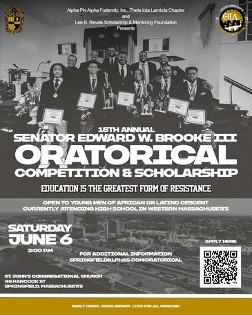 Saturday, June 6, 2026, at 2:00 PM at St. John's Church in Springfield, the Theta Iota Lambda Chapter of Alpha Phi Alpha Fraternity, Inc. and its Lee B. Revels Scholarship & Mentoring Foundation will host the Fourteenth Annual Senator Edward W. Brooke III Oratorical Competition.